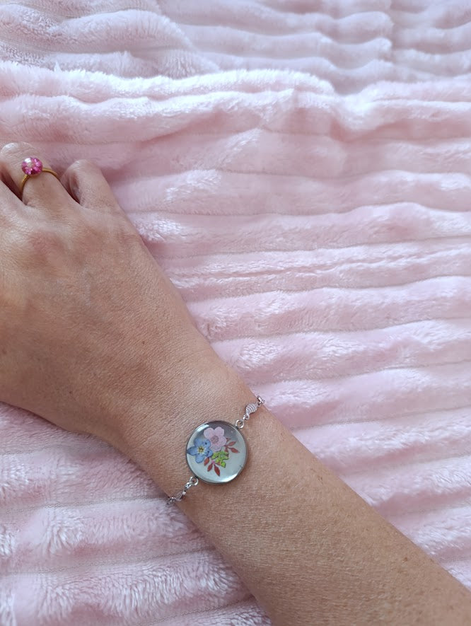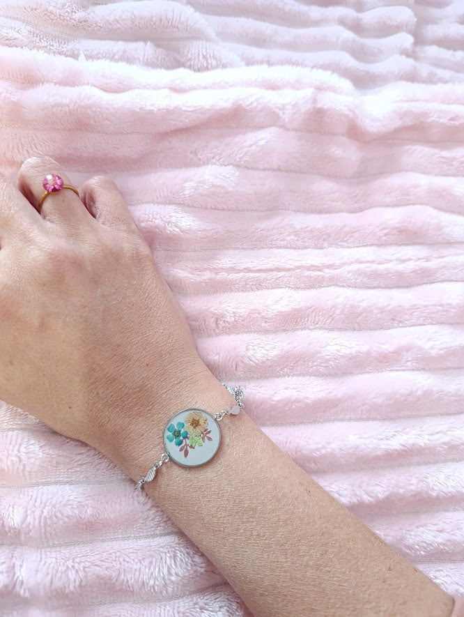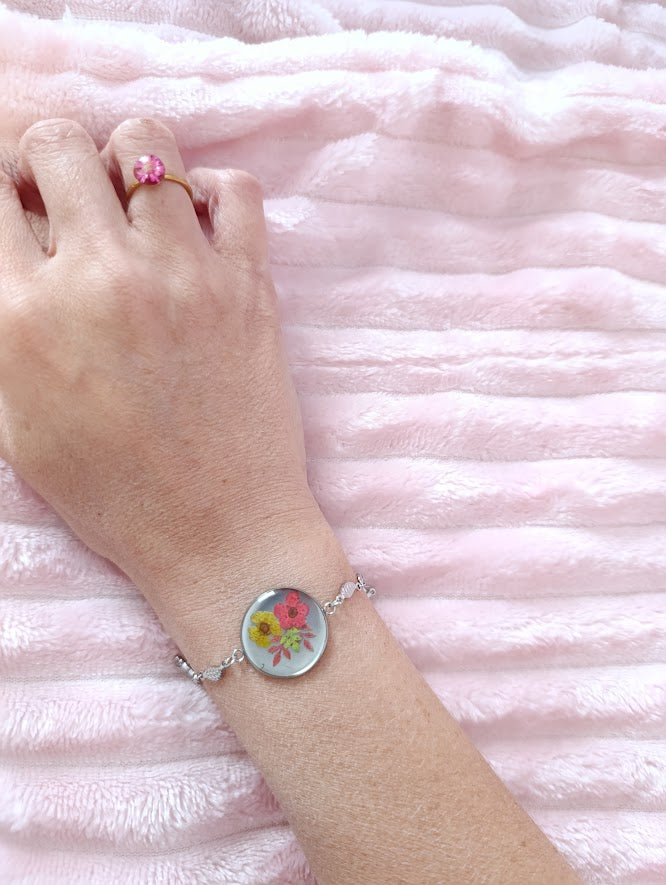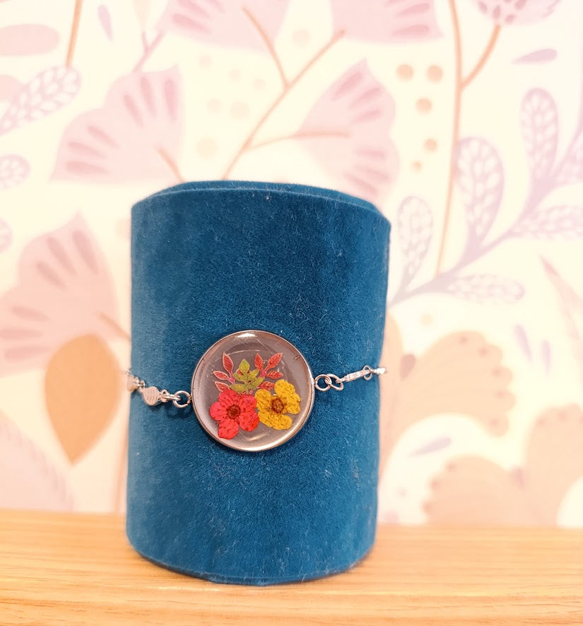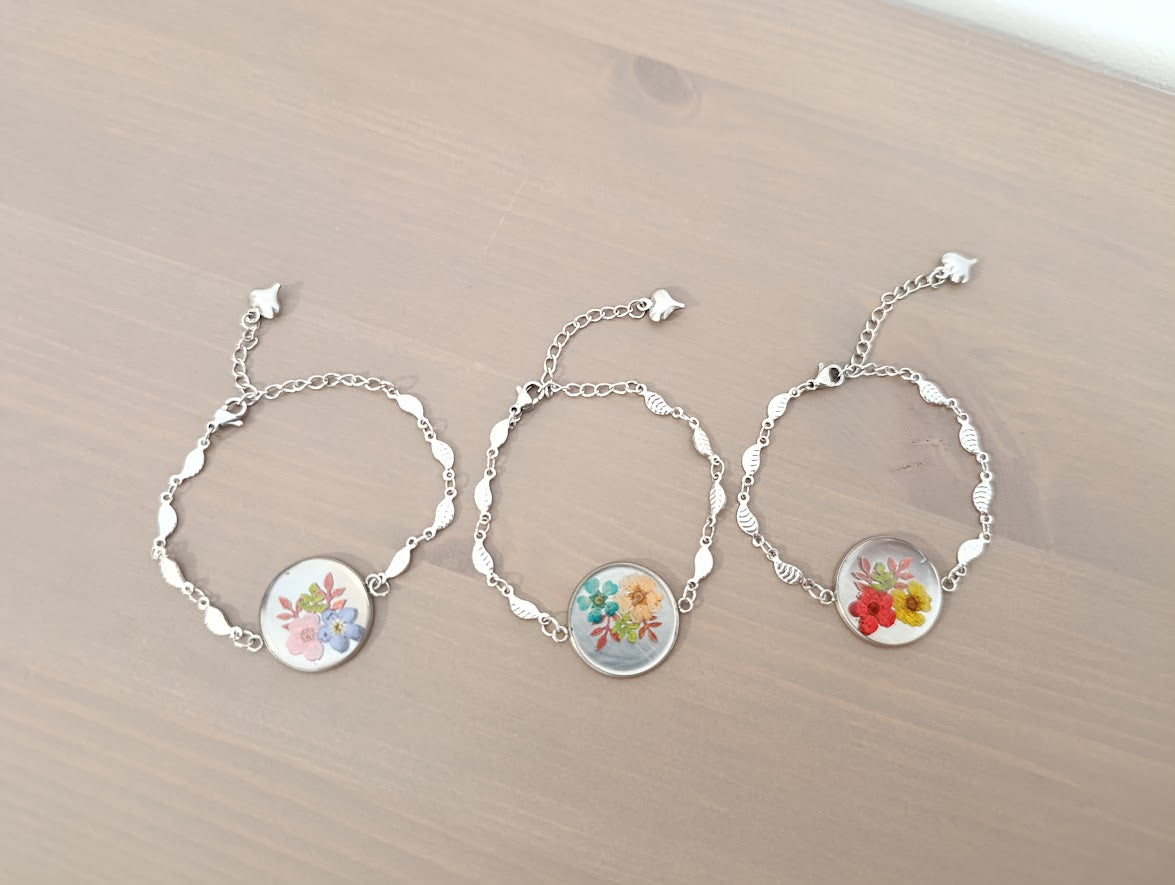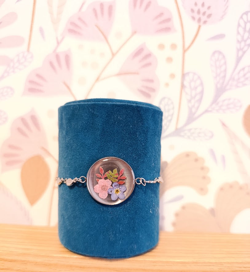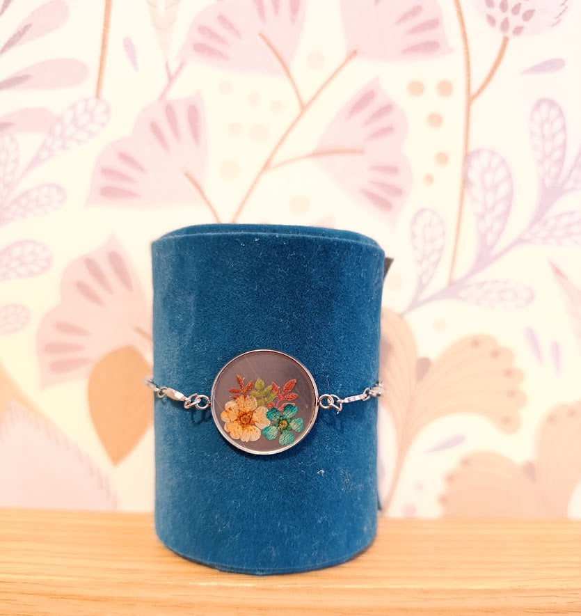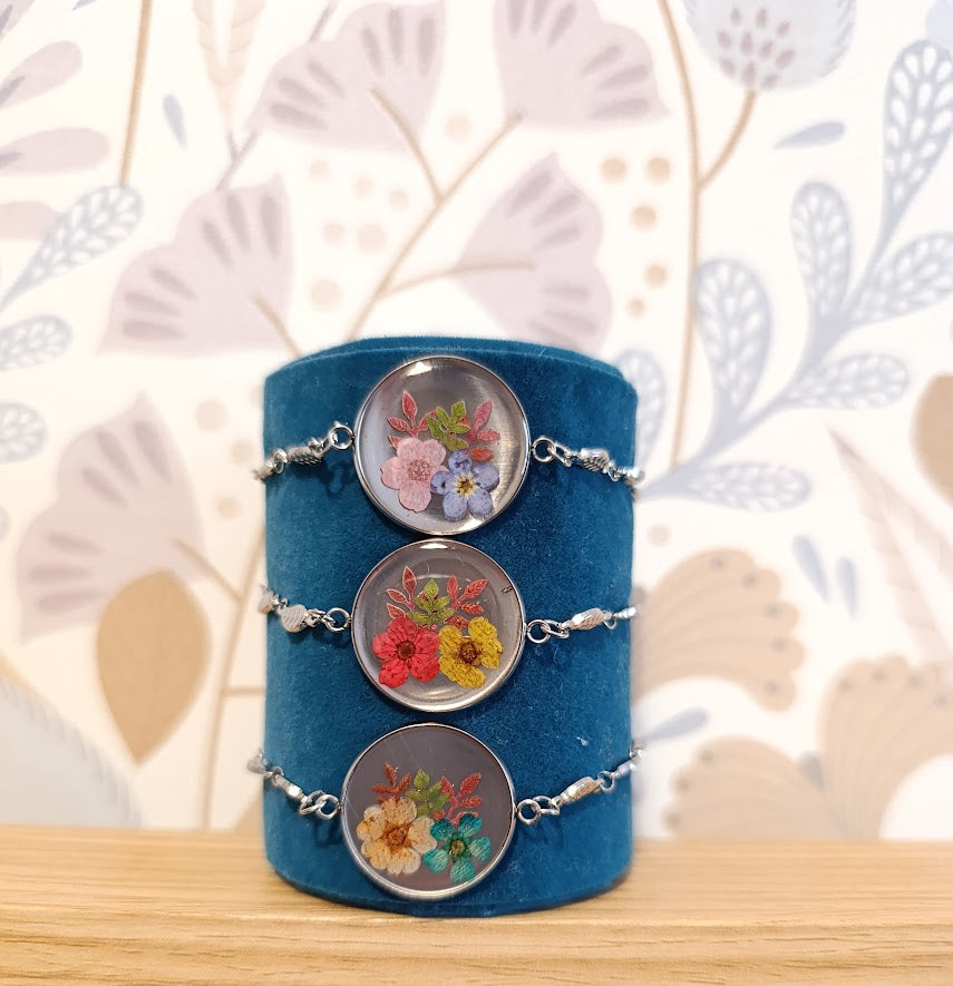 - Pièce artisanale unique, chaque bracelet présentant une disposition florale légèrement différente
